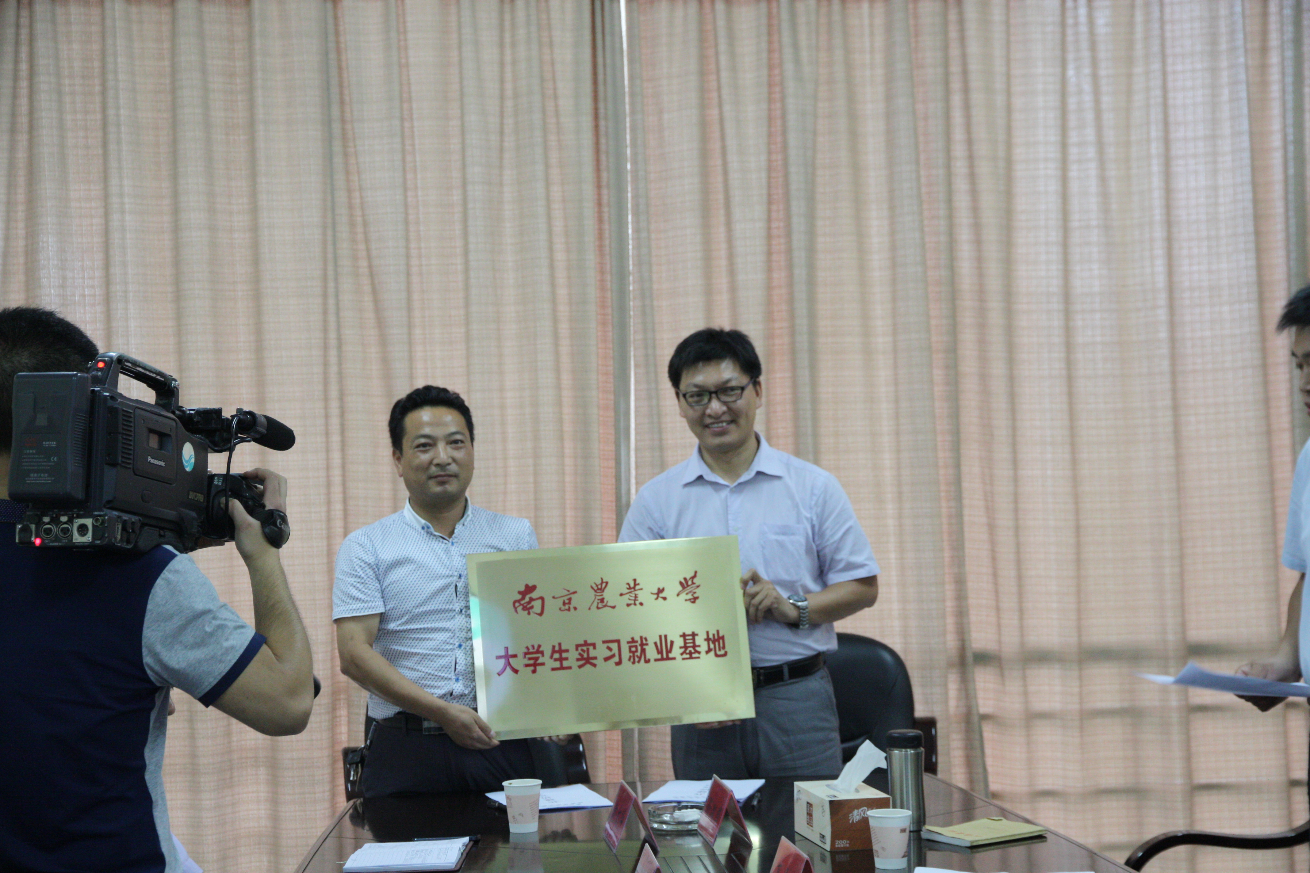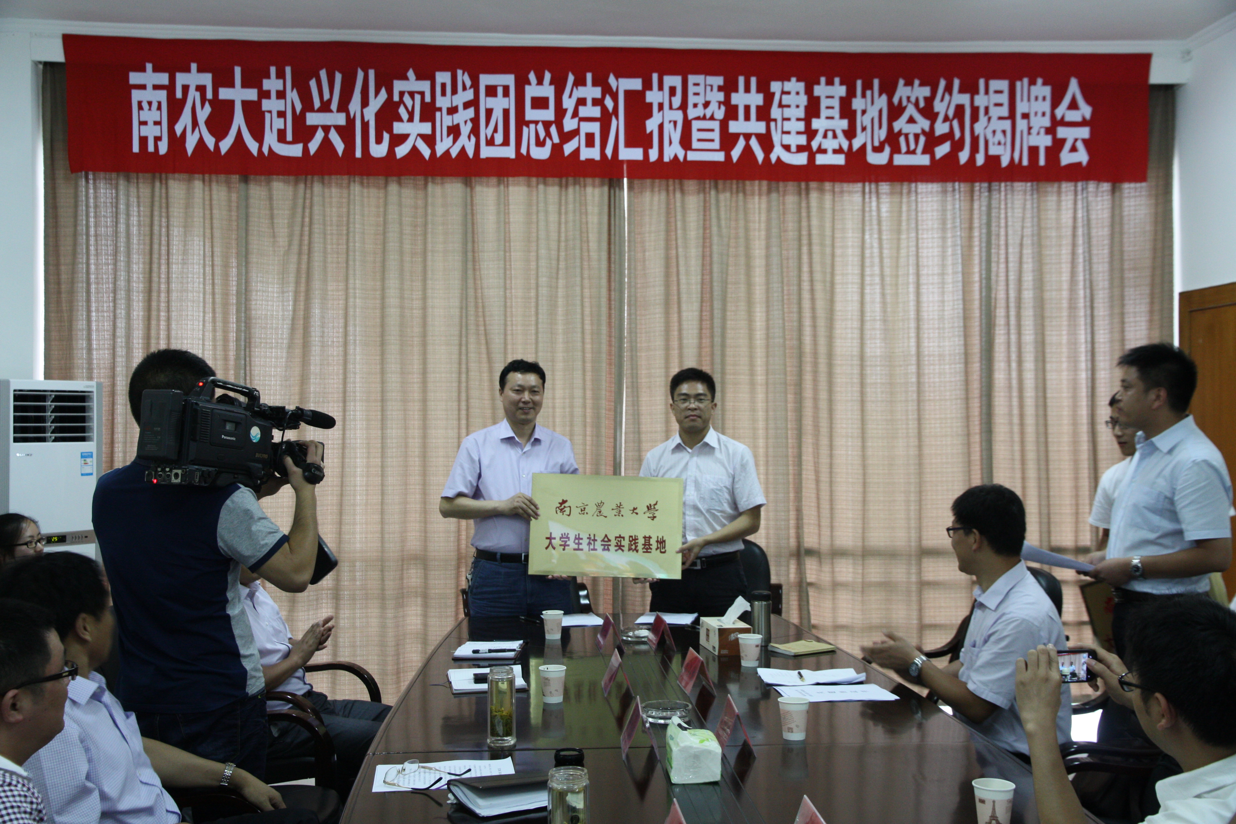 2014年7月14日下午,“南农大赴兴化实践团总结汇报暨共建基地签约揭牌会”在兴化市政府林牧业局举行,出席会议的有兴化市林牧业局陈友洪局长、共青团兴化市委员会吉金楼书记、兴化市大邹镇党委刘启元书记、兴化市委组织部人才科袁文华科长,共青团动漫屋