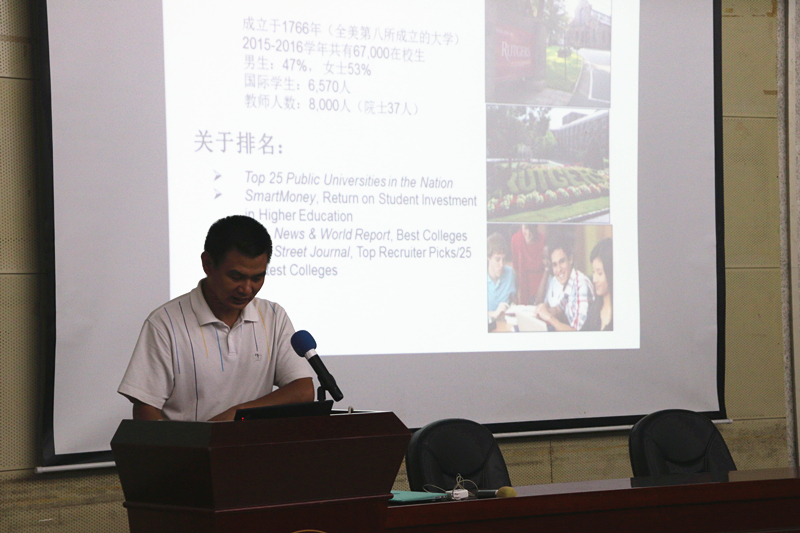 留学情况,教学模式等展开讲解,答疑解惑。随后,于景金老师结合自身留学经历讲述了罗格斯大学的风土人情,并针对现实生活中可能会遇到的各种问题一一解答,解决了在座各位家长对该所大学的疑惑。
