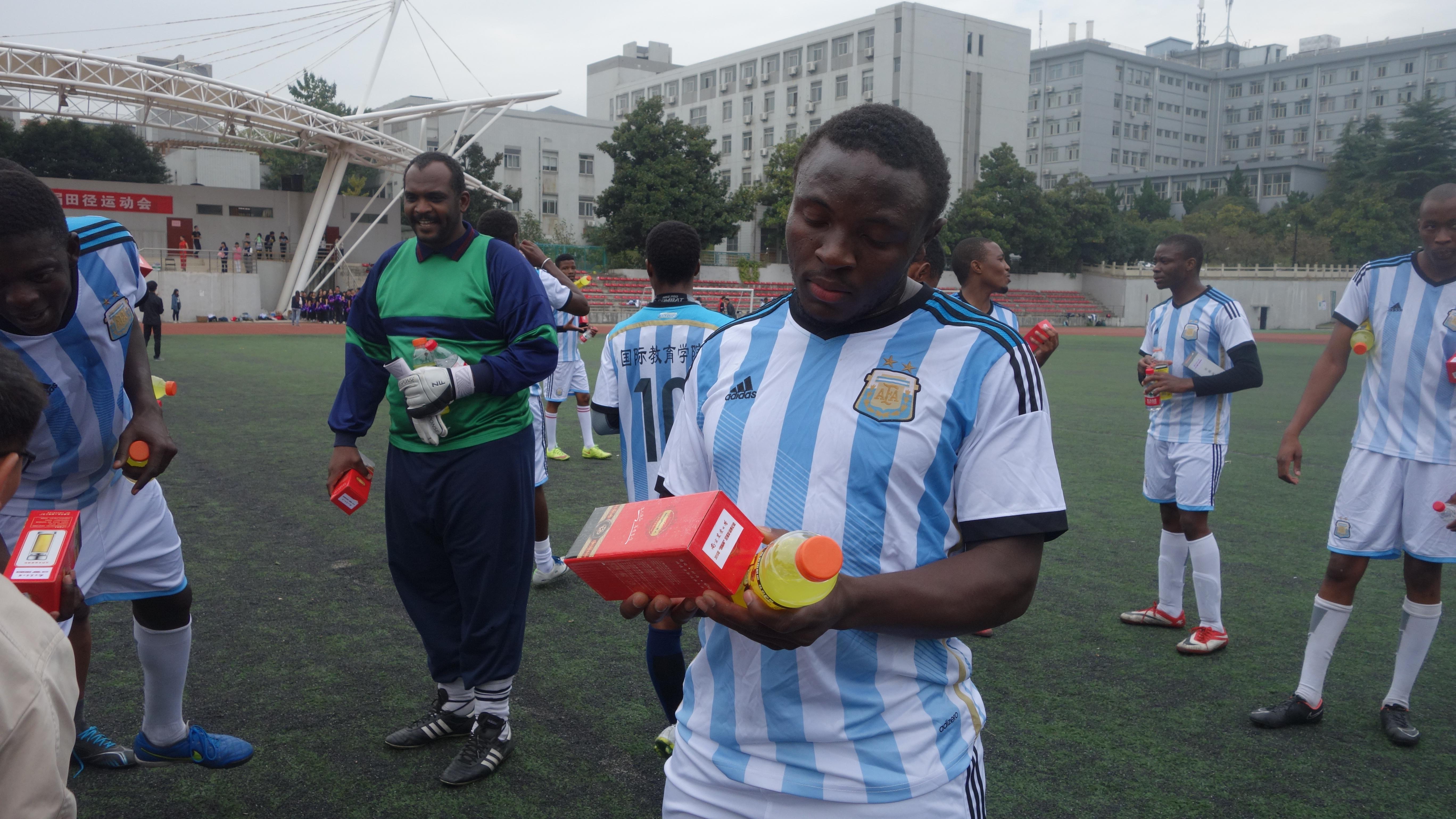 上半场为国际教育学院留学生队与校教工队的比赛,下半场的交流赛则在卫岗校区学生队与国际教育学院留学生队之间展开。场上队员们奋力拼搏,场下观众热情加油,气氛热烈。