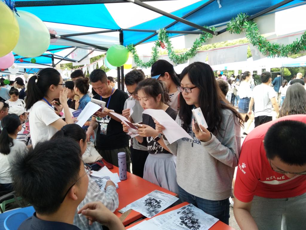 我们院展台前也很快聚集了一大批同学,有深情并茂朗诵经典散文的;有蹙眉凝神思考诗词填空的;有答不上来题目,叫来同学救场的;更有一位热情的外国小哥,积极地参与我们的活动,在我们工作人员耐心亲切地指导下,读完了一段散文,引来现场一片叫好。外国小哥临走时开心地笑了,他的笑容就是对我们活动和工作最大的肯定。