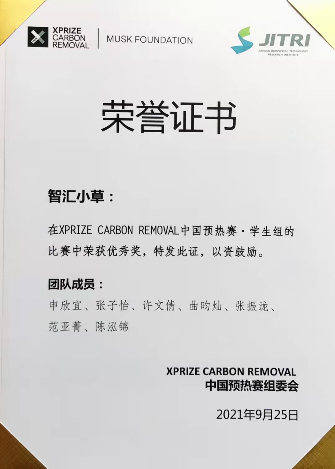 2021年9月24-25日,在“XPRIZE Carbon Removal(碳去除大赛)中国预热赛(学生组)”总决赛中,由草业学院报送的参赛项目《牧草混播技术在园地生态系统碳增汇中的作用》,作为我校唯一一支本科生队伍闯入现场总决赛,获得优秀奖。