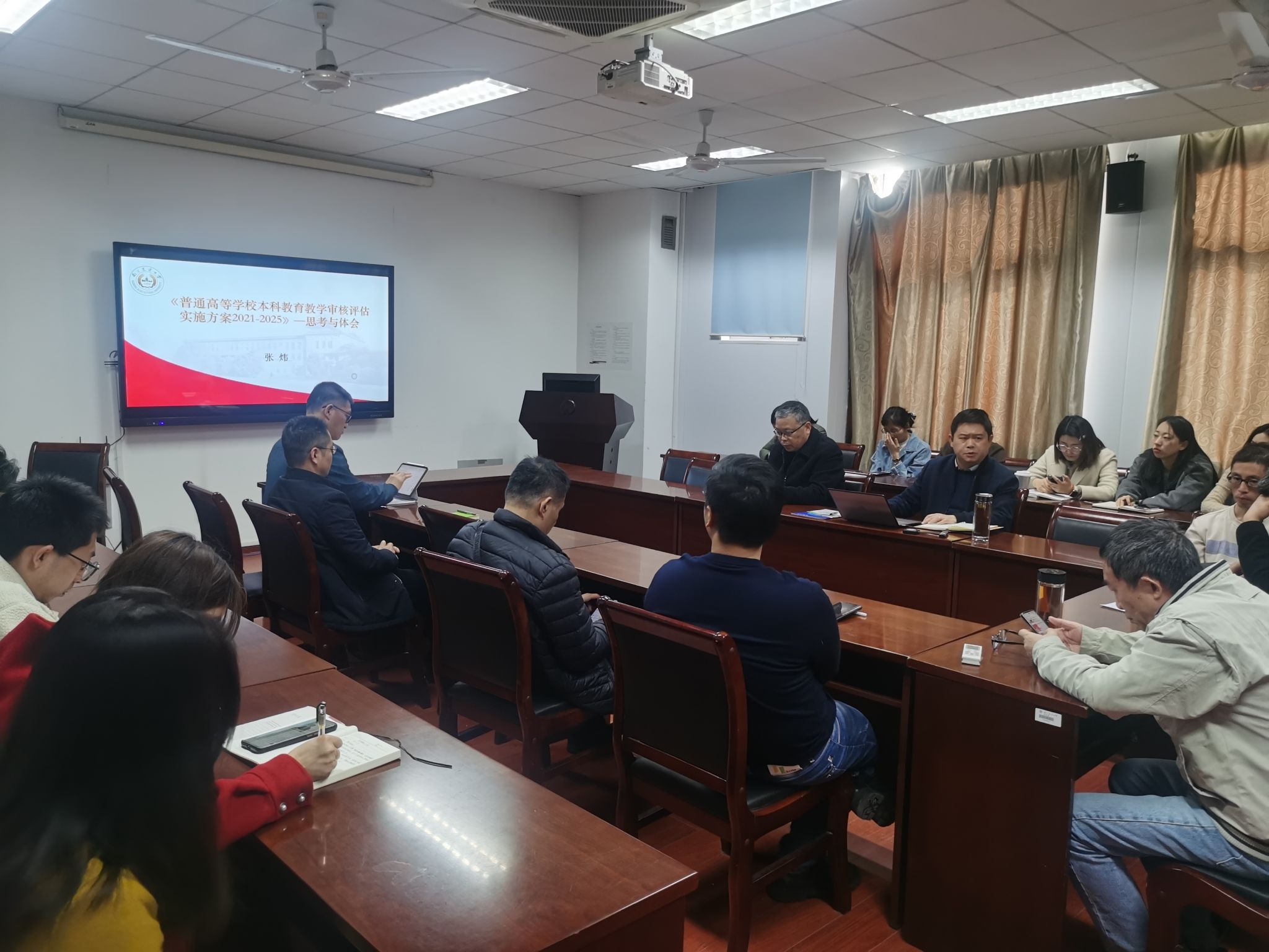 院长张炜做了《 <普通高等学校本科教育教学审核评估实施方案2021-2025>—思考与体会》主题报告,分别从高等教育内涵式发展的质量要求、审核评估的内涵界定、新一轮审核评估的主要特点、新一轮审核评估的核心指标、扎实做好评建工作等五个方面系统解读了新一轮审核评估工作。张炜强调全院教职工要凝心聚力做好评建工作,以新一轮本科教育教学审核评为契机,扎实推进学院本科教育教学高质量发展。