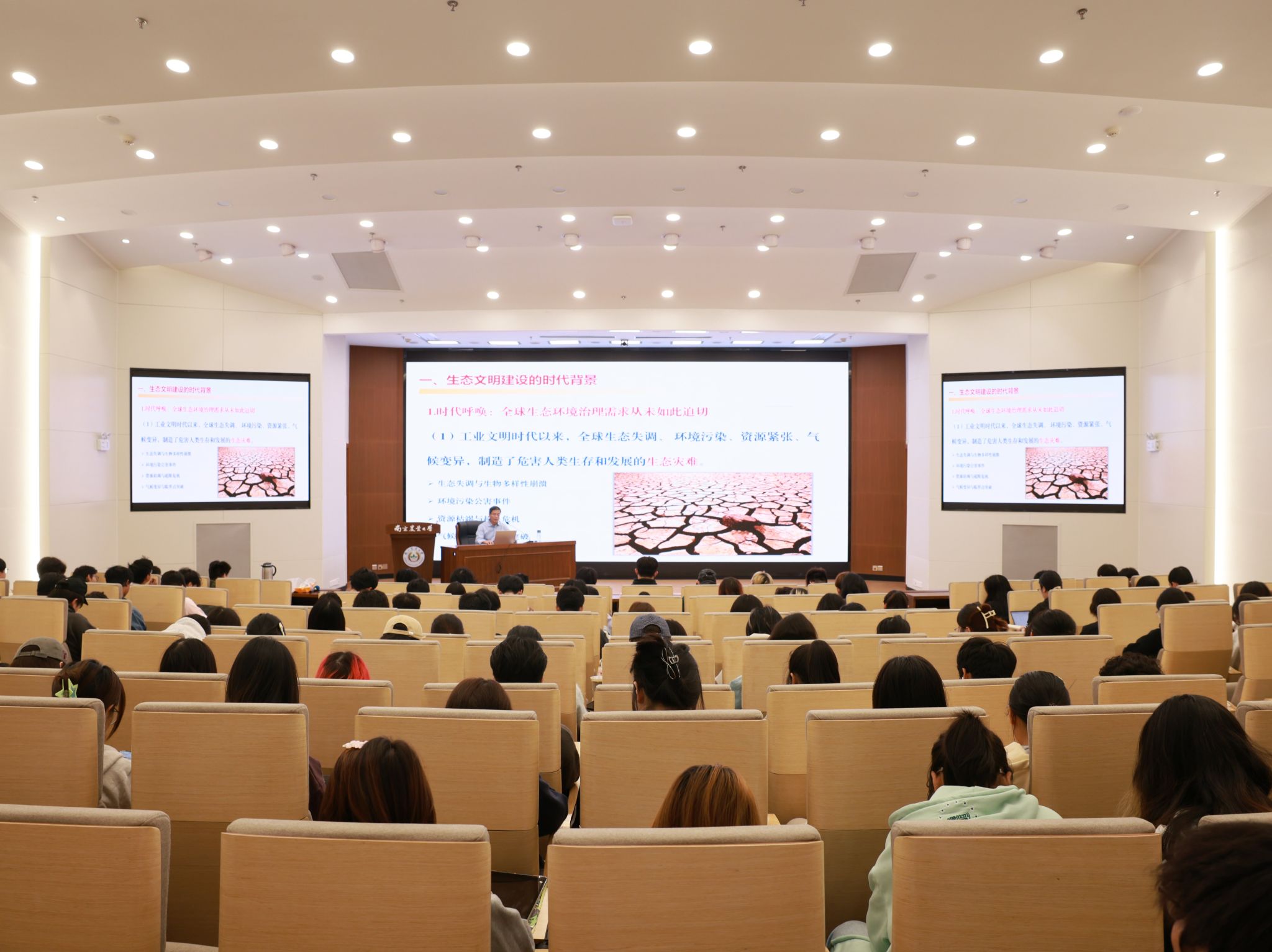 王源超从时代背景、伟大意义、重大实践、历史成就、南农贡献、未来挑战等六个方面全面阐述了生态文明建设的重要性。他指出,在全球生态环境治理需求从未如此迫切的大背景下,生态文明建设关乎中华民族永续发展,是应对新时代社会主要矛盾的重要战略突破。