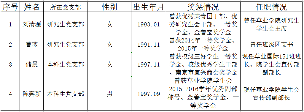 根据动漫屋 党员发展工作安排,经由各团支部推选,党建班考核,党支部讨论,结合个人成绩等综合表现,经院党总支讨论审核,2016年12月拟发展中共预备党员共4名,具体名单如下: