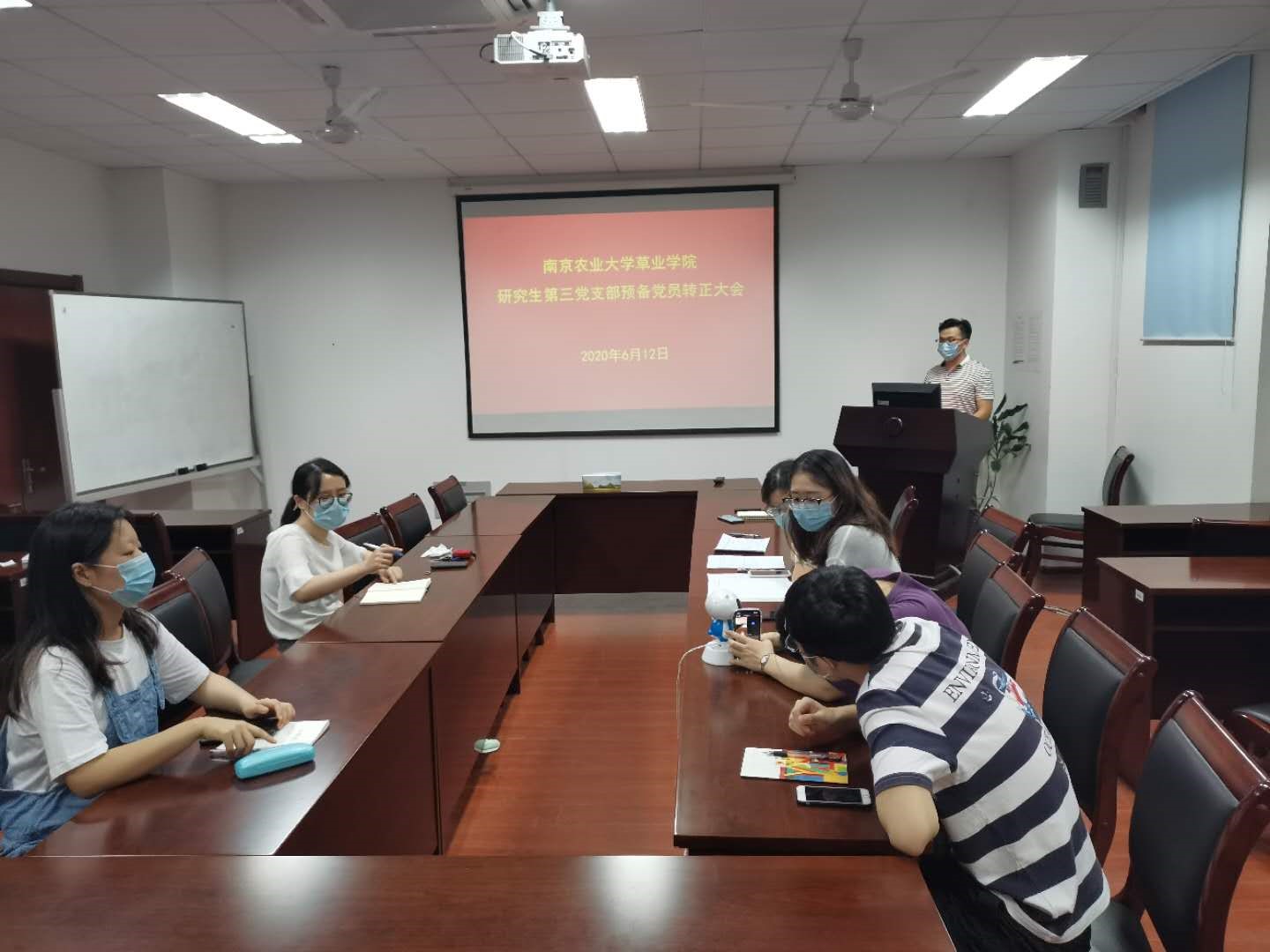 研究生第三党支部在理科南楼F304召开了支部预备党员转正大会,部分党员通过腾讯会议线上参会。会议商讨了支部预备党员王怡超同志的转正事宜。会议由支部书记赵娜主持,共11位参会成员。