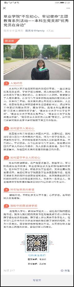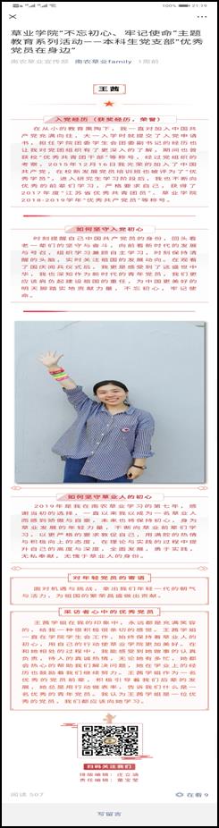 2019年10月,本科生党支部2人一组,精心选取5名本科生党支部的优秀校友进行访谈,讲述他们的入党经历、优秀事迹,生动展现初心故事,通过阐述对草业人初心的认识,寄语年轻党员实现使命担当。10月17日至10月25日期间,优秀事迹一经推送,总阅读量为1145人次,单篇阅读量为507人次,超过学院本科生总人数,激励草业学子为我国草业学科蓬勃发展贡献力量。