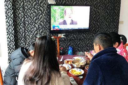 党员方甜梦一家吃午饭。她家在浙江宁波市,为响应当地卫生健康委员会的要求,积极配合政府疫情防控,家庭成员主动减少外出,留在家里,不聚集,不串门。此刻,一家四口聚在电视机前,一边关心疫情情况一边吃饭。这个假期也是她大展厨艺的时候,这不,香喷喷的烤鸡翅就得到了家人的夸奖。