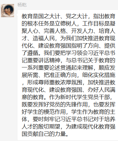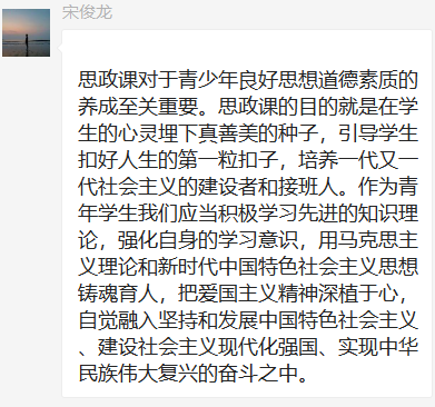 第三党支部党员群中积极发表学习心得。通过本次学习,我们认识到,加强思政课教师队伍建设,就要按照习近平总书记提出的六个方面的要求,坚持政治要强、情怀要深、思维要新、视野要广、自律要严、人格要正。“思政课”是党员干部的好必修课,为党员干部树立了正确的世界观、人生观和价值观。学好。思政课。贵在持之以恒。党员干部要坚定”四个自信”,做到。两个维护”,认真答好”初心篇””劝学篇”和”检视篇,在常思常省.善学善为、立行立改中同祖国共同驶向民族复兴的伟大彼岸。