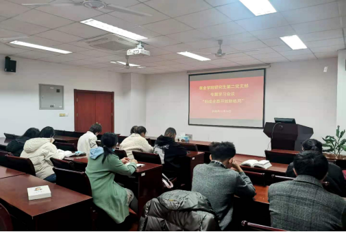 赵冉冉同志带领大家重点学习了习近平总书记就“形成全面开放新格局”提出许多重大思想观点,主要包括中国开放的大门只会越开越大、稳步推进中国特色自由贸易港建设、共建创新包容的开放型世界经济、开放合作,命运与共等四个部分的内容。她指出,作为研究生的我们要能够与时俱进,顺应历史的潮流,以更加开放的心态来坚定自己理想信念。