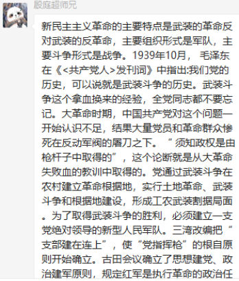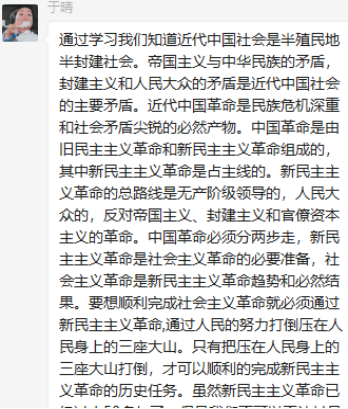 郝田首先分享了“夺取新民主主义革命胜利相关”的相关学习资料,从“重庆谈判和争取和平民主的努力”“以自卫战争粉碎国民党的军事进攻和开展第二条战线的斗争”“人民解放军转入战略进攻和土地制度的改革”“伟大的战略决战和国民党反动统治的覆灭”以及“党的七届二中全会和人民政协的召开”这几个方面系统的介绍了从抗战胜利以来到新中国成立前夕,中国共产党是如何带领全国人民逐步粉碎国民党军事进攻,赢得战场上的主导权,最终取得新民主主义革命的胜利。