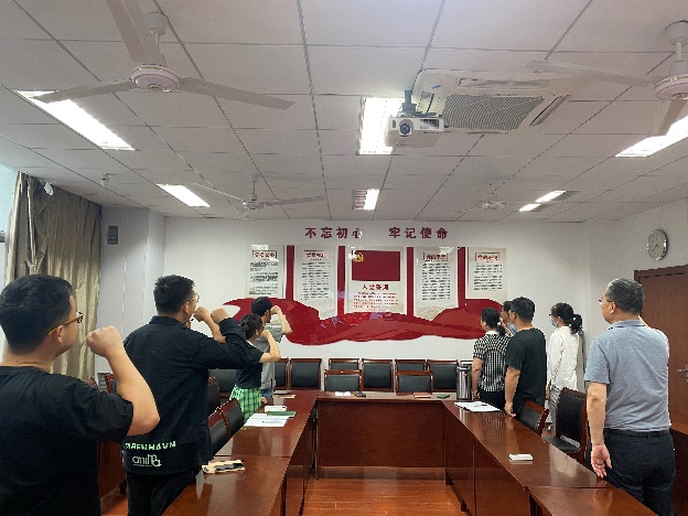 会议第一项议程:重温入党誓词。在邵涛书记的带领下,全体党员同志面对鲜红的党旗和庄严的誓词,共同高举右拳,庄严宣誓。