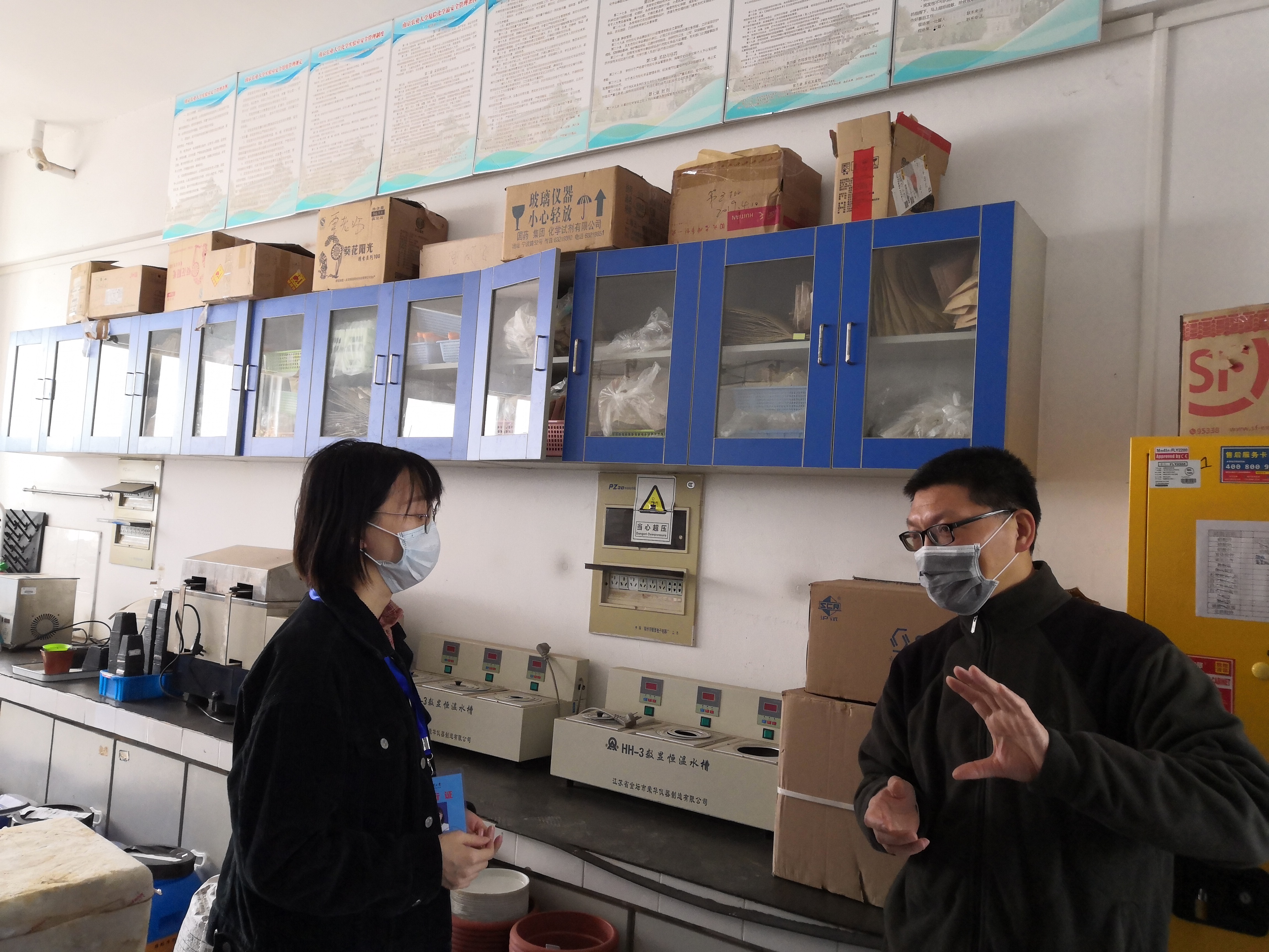 4月16日上午,学院又组织了学院内部实验室疫情防控和安全管理自查工作。在自查过程中,高务龙检查了各团队防疫物资准备情况,突出强调了各实验室要每天进行环境消毒与清洁、要妥善分批安排师生按排定日程时间进出实验室、所有进出实验室的师生均须落实签到与签退制度等要求,以保证实验室内部人员有足够的安全距离,并保证对人员往来情况可进行有效追溯。