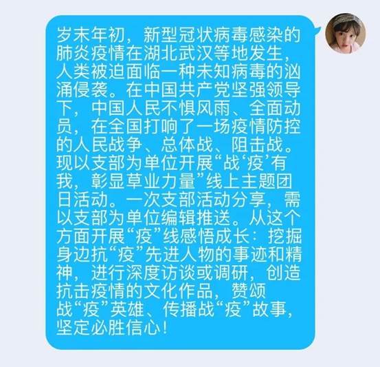 本月下旬,草业国际191班举行了战“疫”有我主题团日活动-----支部活动分享,同学们纷纷积极响应!