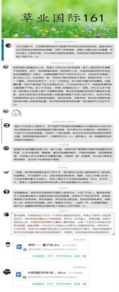 线上学习之后,草业国际161团支部便在线上进行了讨论,每位支部成员都针对发生在自己身边的事例讲述了自己的感受与体会,其中不乏很多感人的小故事,平凡中发现伟大,感人泪下。