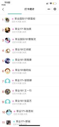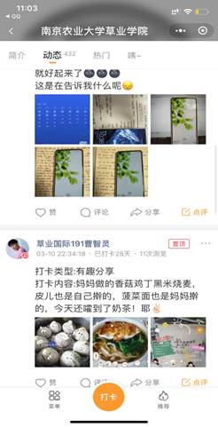 除此之外,学院发起了”抗疫学习两不误,21天好习惯养成计划“通过“学习打卡”、“读书充电”、“健身达人”、“美食小当家”四种形式,让同学们逐步规律作息,积极开展锻炼,提升自我,避免了宅家的枯燥与乏味。