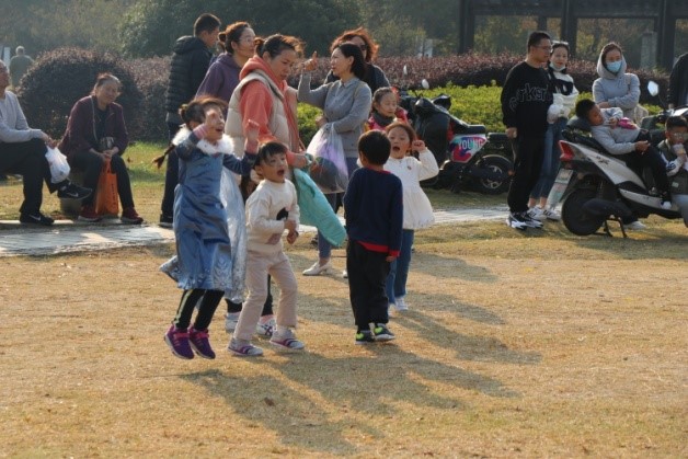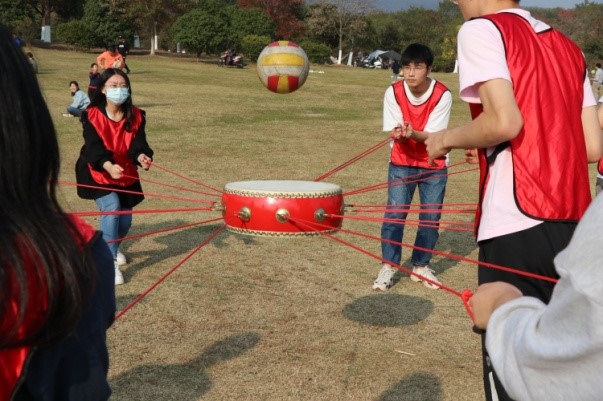第二个项目是同心鼓。游戏开始时,每组所有人都上场,每个人拉着鼓的一根绳子,每个队员牵拉一根绳子,保证鼓面水平。同时另选出一名队友将一个排球从鼓面中心上方竖直抛下,队员们齐心协力将球颠起,颠球次数最多者胜出,颠的次数最少的组享受抽签惩罚。该项目非常考验团队协作能力,需要每个人的通力配合,最后大家的成绩都很不错,最高的组颠了118次。同心鼓项目还引来附近小朋友的热烈加油,现场气氛燃到极点。