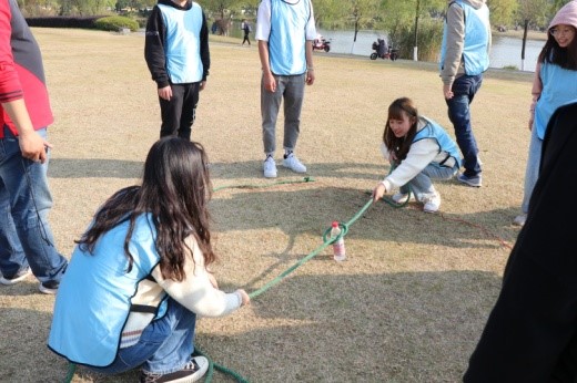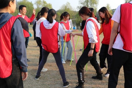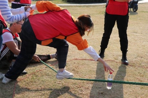 管老师先是用一个小游戏带动了大家的氛围,然后将所有人分为了红、粉、蓝三组,还分发了相应颜色的小马甲,每个小组还展示了各自的队旗、口号和队歌。随即开始进行正式活动。活动分为三个项目:一、雷区取瓶;二、同心鼓;三、决胜150。