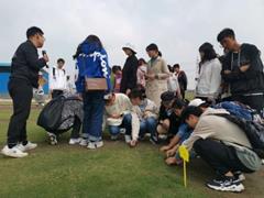 之后我们驱车前往草坪试验站。狗牙根、结缕草、海滨雀稗,不同类型的草坪草形成了颜色和形态各异的草坪,大家欢乐地踩在草地上,感受草坪的魅力。