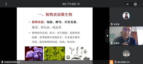 张教授以《植物表面微生物的研究与应用》为题展开了报告。研究植物表面微生物帮助了解植物病原菌存在状以便开发新方法控制其发展与传播,防止食物中毒,产品贮藏、加工时有效利用。张教授首先给大家介绍了加州大学伯克利分校植物与微生物系的植物病理学家Steve lindow 教授研究的丁香假单孢菌。紧接着为大家详细阐述了微生物对植物表面环境的改变与适应,影响植物表面乳酸菌的因素,植物表面微生物的应用等问题。张教授的分享结束后,老师和同学们对不同叶型对苜蓿产量差异,实验过程中添加不同类型糖溶液处理过程的做法等问题进行了热烈交流。