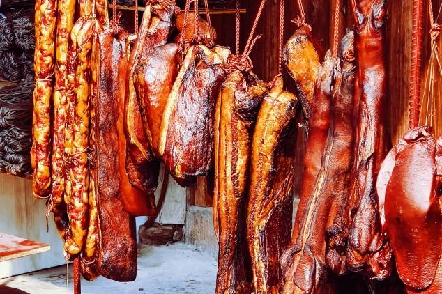 今年,我学习了如何腌制腊肉腊肠。在集市上精挑细选肥瘦相间的猪肉,拿到家后,按照一斤肉两钱盐的规则,算好盐的用量。手洗净后,将雪白的盐均匀地撒到猪肉上,然后就开始给猪肉“按摩”,仔细地将猪肉上的盐揉搓。揉搓完毕后,将猪肉放置几天,等待盐开始发挥作用。几天后,把猪肉洗净,用绳子挂起来。挂的地方自然也有讲究,要挂在煮饭做饭的烟能熏到的地方。在烟火的熏陶之下,猪肉会从原本的颜色,逐渐变为黄灿灿的颜色。而它的口感,也会更多一份香气。在春节,腊肉腊肠,烹饪了人们一年来的苦涩与辛苦,端出了温馨的团圆和幸福。