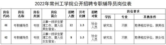 根据《江苏省事业单位公开招聘人员办法》(苏办发〔2020〕9号)精神,常州工学院现面向社会公开招聘专职辅导员20人。现将有关事项公告如下: