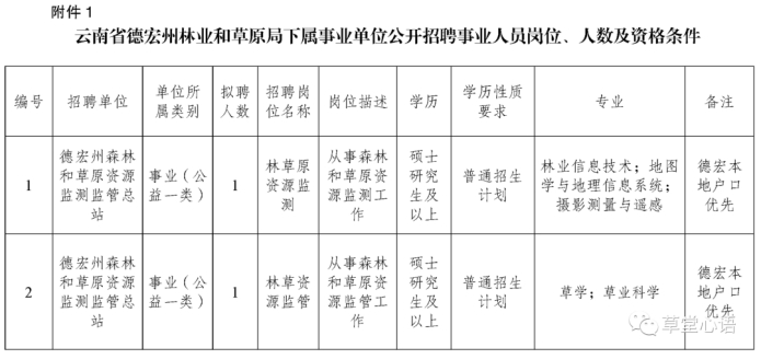 德宏州森林和草原资源监测监管总站2名,具体岗位、条件要求等详见附件1。