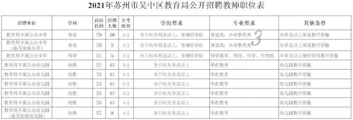 根据《省教育厅省人力资源和社会保障厅关于进一步做好全省中小学校新进教师公开招聘工作的意见》(苏教规〔2016〕1号)有关规定,经研究,2021年苏州市吴中区教育局下属公办学校公开招聘教师298名。现将《2021年苏州市吴中区教育局公开招聘教师公告》(以下简称《公告》)公布如下: