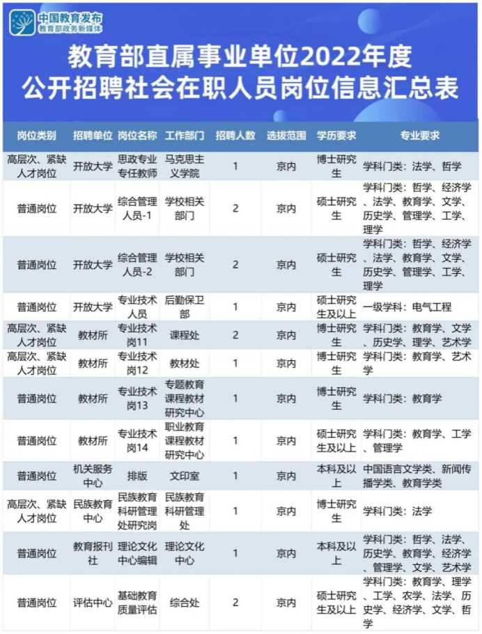 招聘啦!教育部直属事业单位2022年度公开招聘开始了。本次共有19家单位面向应届毕业生公开招聘140人;6家单位面向社会在职人员公开招聘16人。