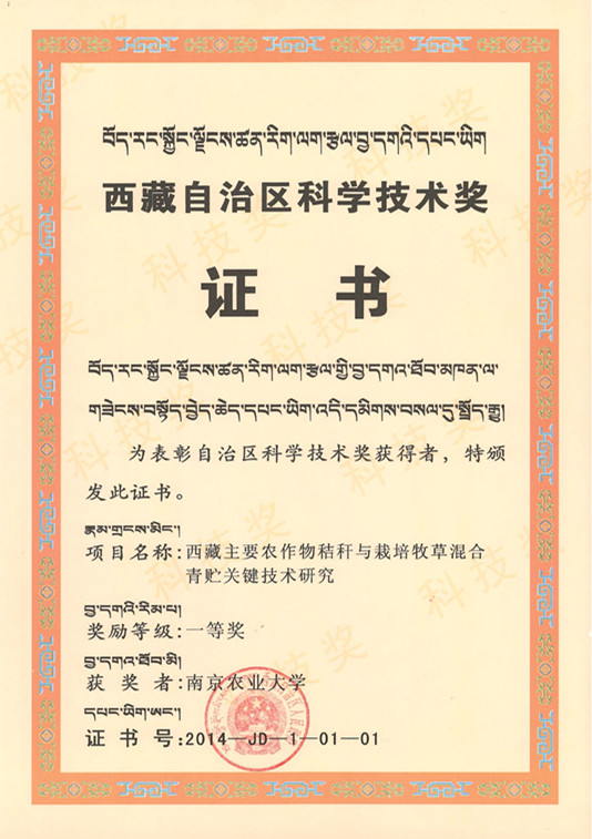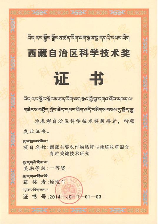 为第一完成单位的研究成果“西藏主要农作物秸秆与栽培牧草混合青贮关键技术研究”获得西藏自治区科学技术奖一等奖,成果联合完成单位有中国科学院地理科学与资源研究所、西藏自治区农牧科学院、西藏日喀则地区草原工作站。