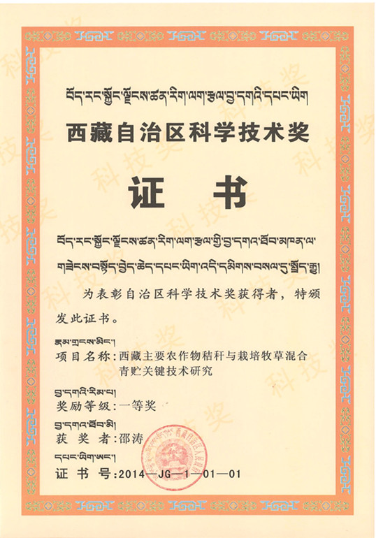 据了解,西藏自治区科学技术奖是为了加速西藏经济社会发展,推动科学技术进步,由西藏自治区人民政府设立,每两年评审奖励一次。“西藏主要农作物秸秆与栽培牧草混合青贮关键技术研究”的研究成果是2012—2013年度西藏自治区38项科学技术奖中农业领域唯一的一等奖。