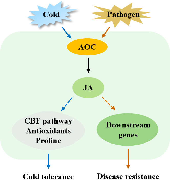 图1 苜蓿AOC2基因调控耐寒和抗病性的模式图